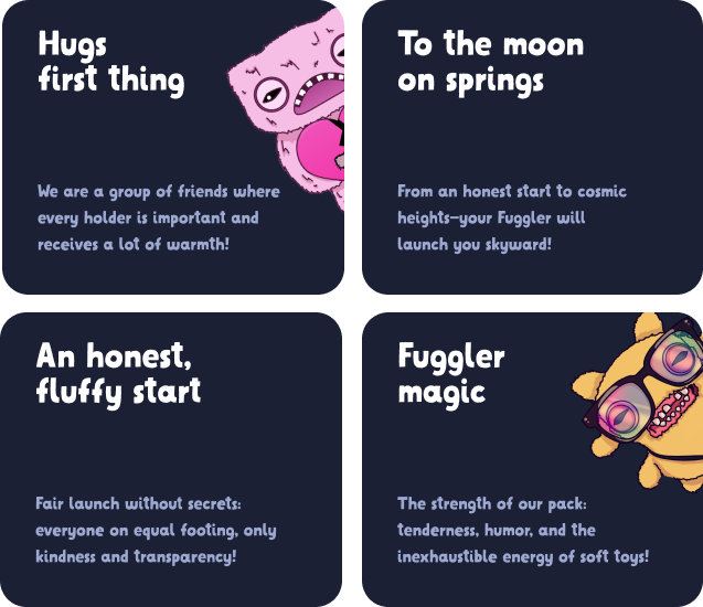 Fuggler isn't just a meme coin, it's a fluffy adventure in the world of soft toys! Our cute, cartoon monsters bring together everyone who loves hugs and dreams of the moon. Together, we jump from hold to hold, full of warmth and crypto joy!